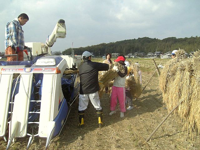はさ掛けした稲が乾いたので、今日は脱穀です。コンバインを田んぼに持ち込んで、その脱穀機の部分に稲を通しました。9:30に集まって、11時過ぎまでみんなで作業しました。