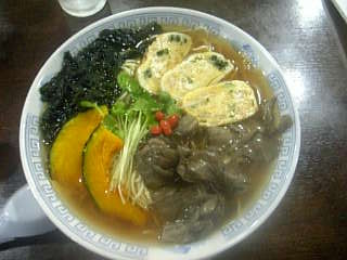 年齢とともに「味食ラーメン」のコッテリ感が重たくなってきて、でもあっさりタイプの「薬膳ラーメン」に使用しているハトムギ麺の食感がイマイチしっくりこないので、それならば「薬膳」のスープと具に「味食」の麺を浮かべてしまえ!と思ったわけです。女将さん快く何でもしてくれます。