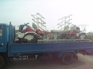 今日から瀬戸内市振興公社の田植えに出動。朝出勤してみると、早くもトラックの上で待機する田植機たち。