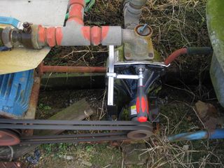 よく観察すると、ポンプのフレームの一部に小さなクラックが入っている。それが原因で、フレームの合わせ目に隙間ができ、そこから水が漏れている。とりあえず、応急手当として、合わせ目にシールテープを挟み込み、万力で力いっぱい隙間を押さえ込んだら、とりあえず水漏れはおさまった。