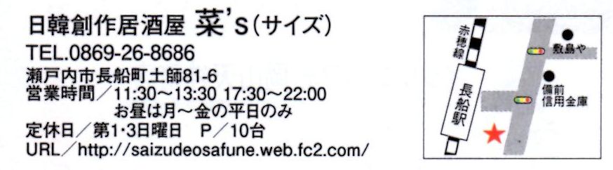 「Smile 12月号」に、こんなふうに載ってましたけど、「長船DE居酒屋STYLE 菜's」じゃなくて、「日韓創作居酒屋 菜's」になったんだろうか。