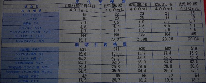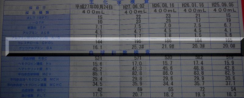 思い起こせば2012年10月17日、その日の献血でGA値は「30.2」という天文学的数値を記録したのでした。その頃は、糖尿病的自覚症状もありましたので、びっくりしてあわてて闘病食を実行。