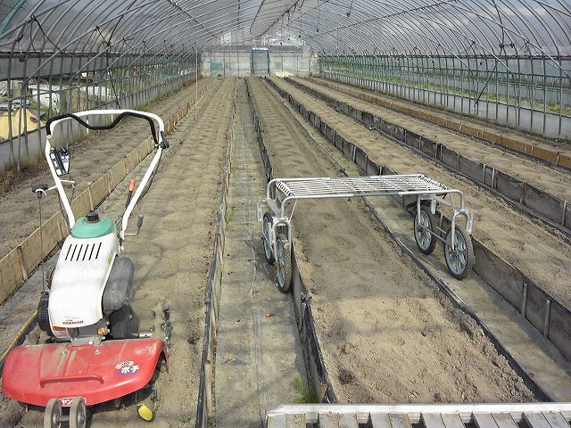 昨日と今日で、イチゴハウスのうね上を耕しました。