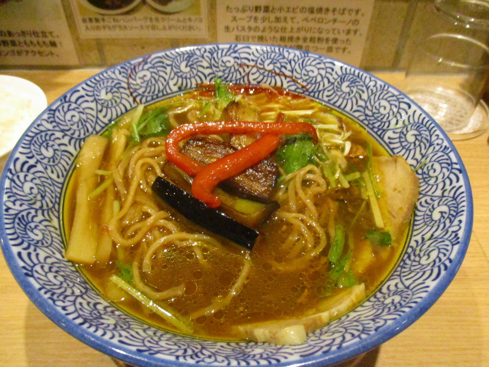 ここで問題発生。わたくし、カレーラーメンには茄子の素揚げが絶対必須だと考えており、注文時にお姉さんに茄子の素揚げが入っているのか確認を取りました。そしたら、この人は茄子が嫌いなのだと勘違いされ、茄子の素揚げ抜きで配膳されてしまったのでした。その代わり、メンマが入っています。