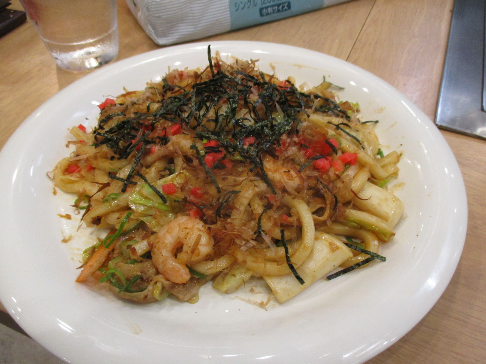 ずいぶん待って、出てきたのは「焼うどん」でした。だいたい「海鮮焼うどん」なんていうメニューは無いぞ。鉄板でうどんが焼かれているのを見ながら感じていた嫌な予感は、当たってしまいました。