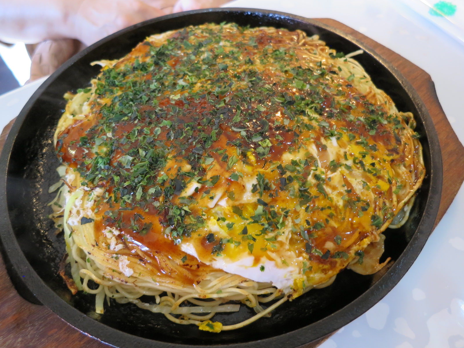 これは、お好み焼きの「豚玉そば入り」。細麺を使っています。