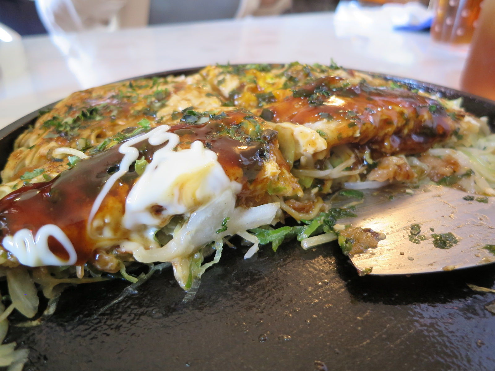 テーブル席にボケーっと座っていたら、鉄板越しに「まあ、誰かと思ったら!」といつもの威勢のいい声。「いや、この前来たら、休みだったんですよ。」と、責められてもいないのにとりあえず言い訳の弁。