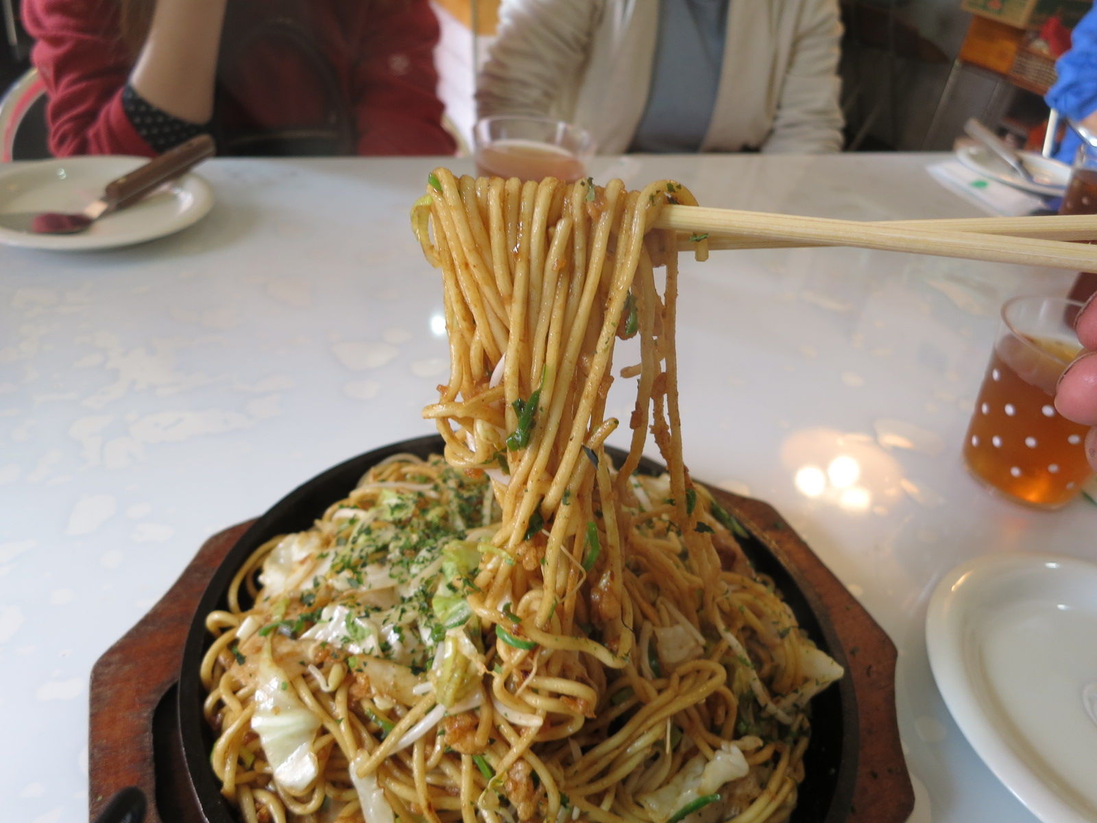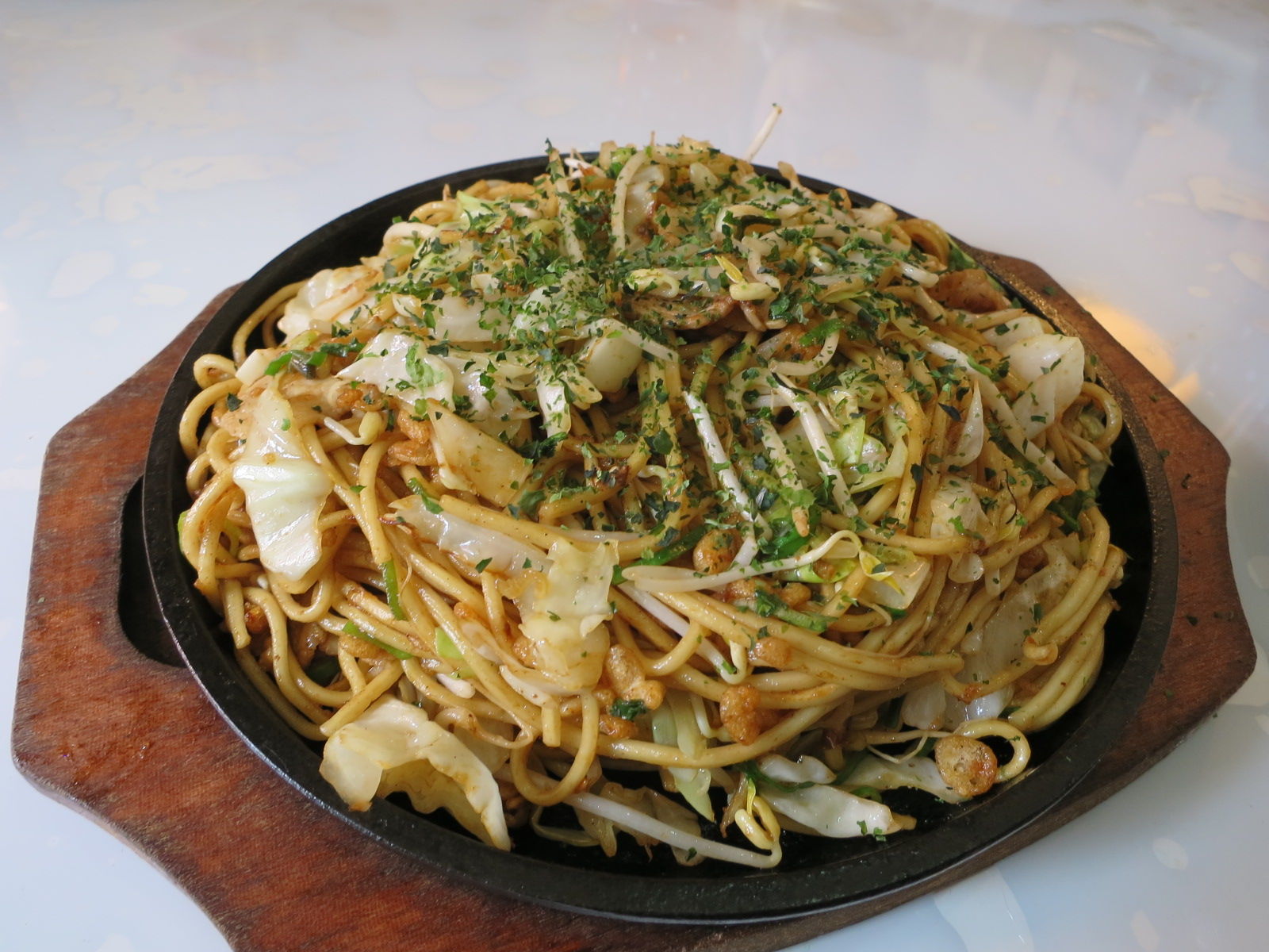 茹で上げたばかりの細麺を丸く成型して、鉄板で相当焼き込んでいますので、カリカリっと仕上がっています。