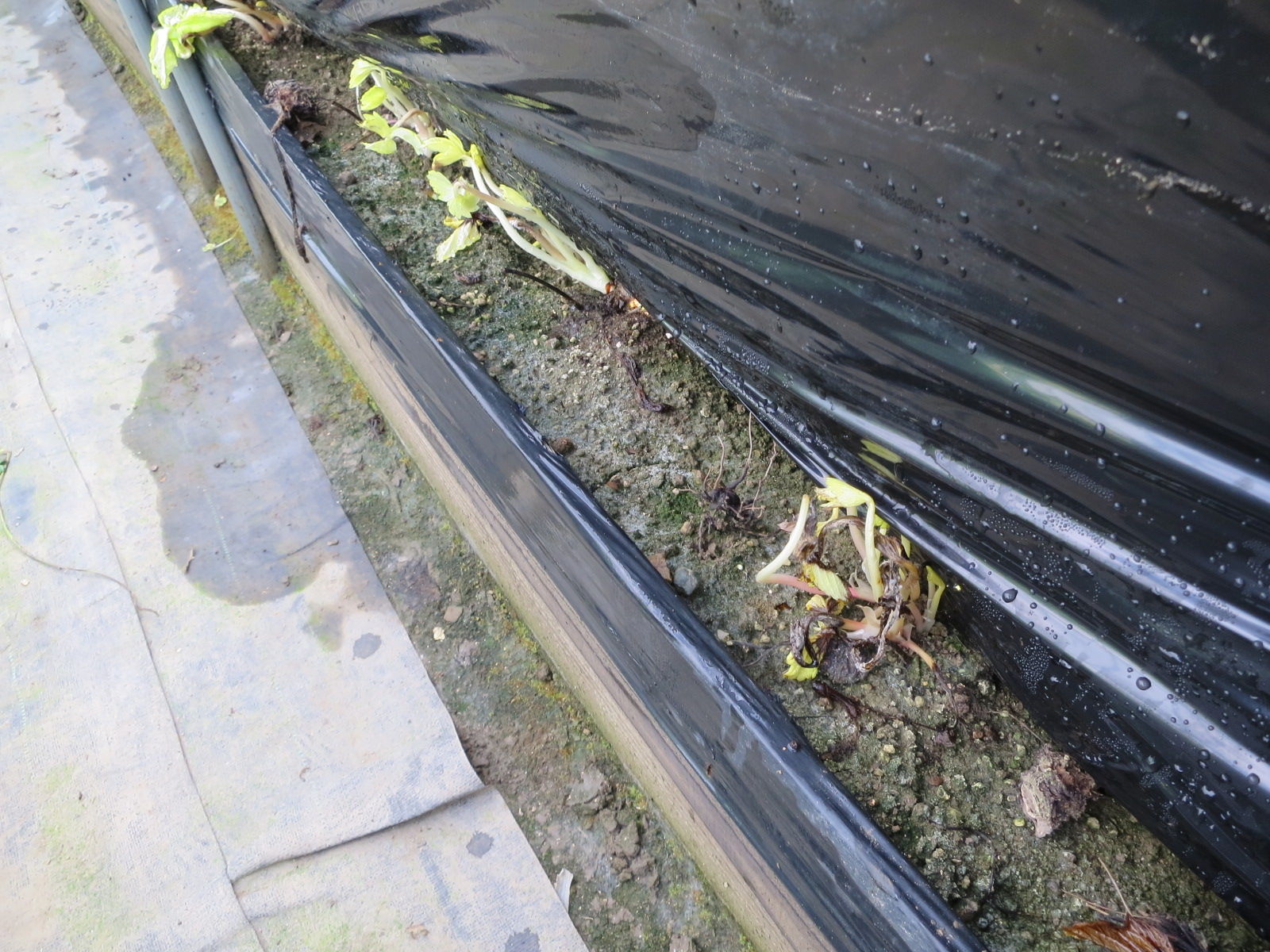 黒マルチの下で、めきめきと育っている「ドロ芽」の摘除。