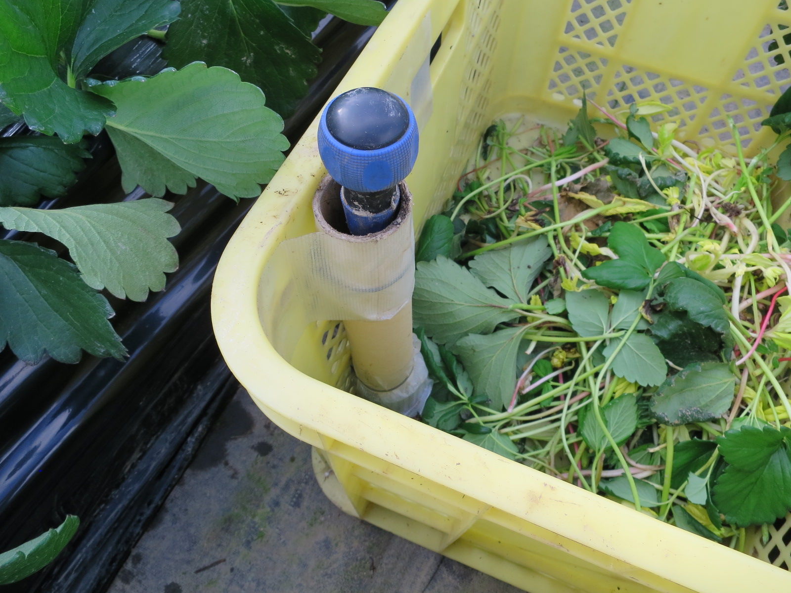 ドロ芽摘除の必需品、マイナスドライバーのホルダーを、黒マルチの芯を加工して作りコンテナに縛りつけました。