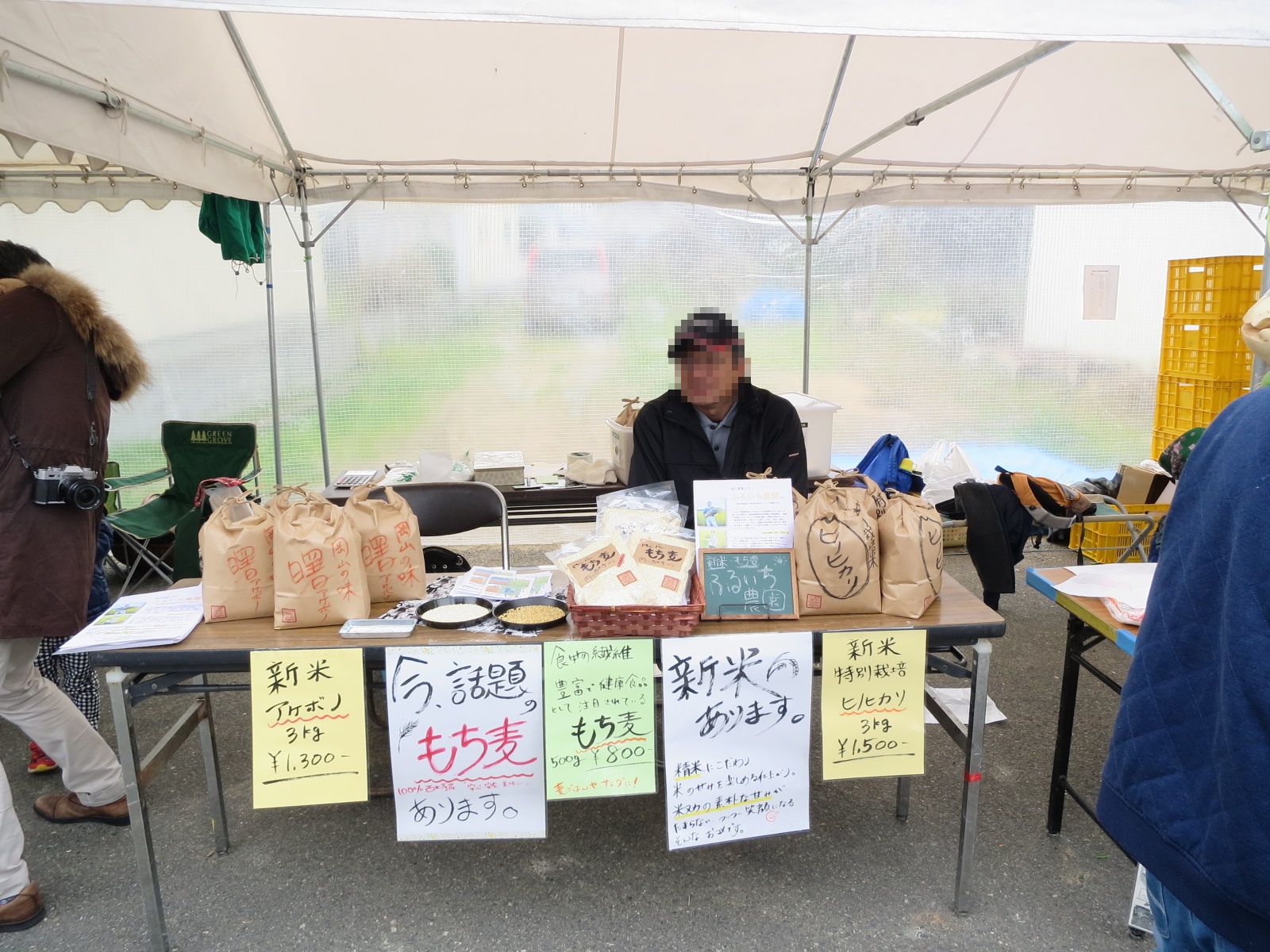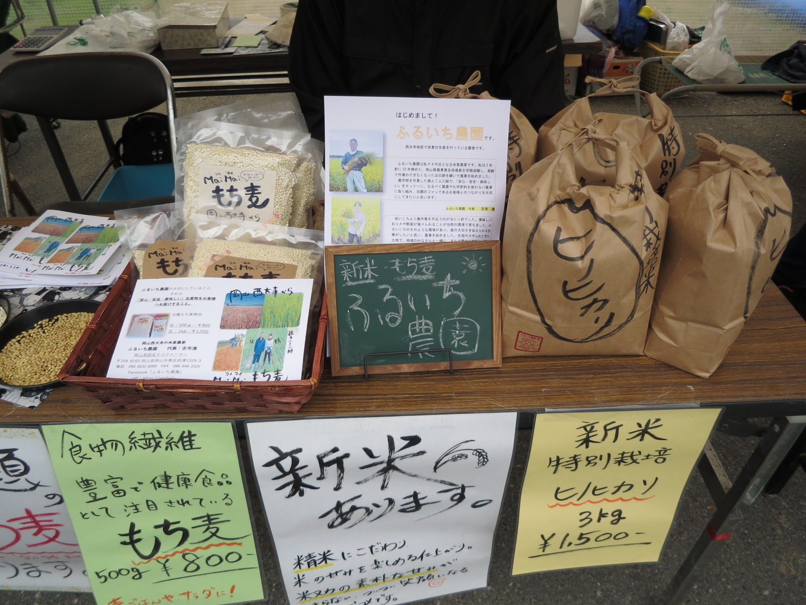 今を時めく「もち麦」と、ふるいち農園ご自慢の新米で、福岡の市の賑わいに一役買っていました。