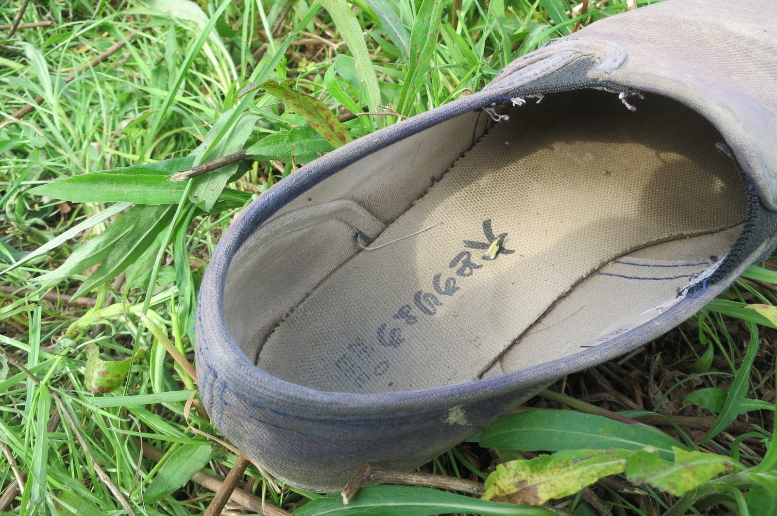 なんと、刈った枯れすすきの残り茎の先が、ゴム底を突き抜けて足裏を攻撃しています。