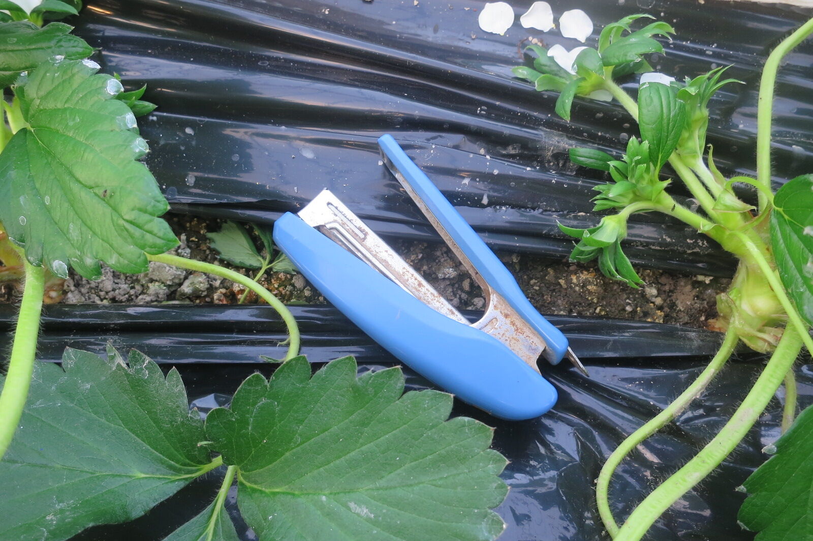 この前条間に敷設して仮止めした黒マルチに対して、通路側からマルチを合わせホッチキス止めしていきます。