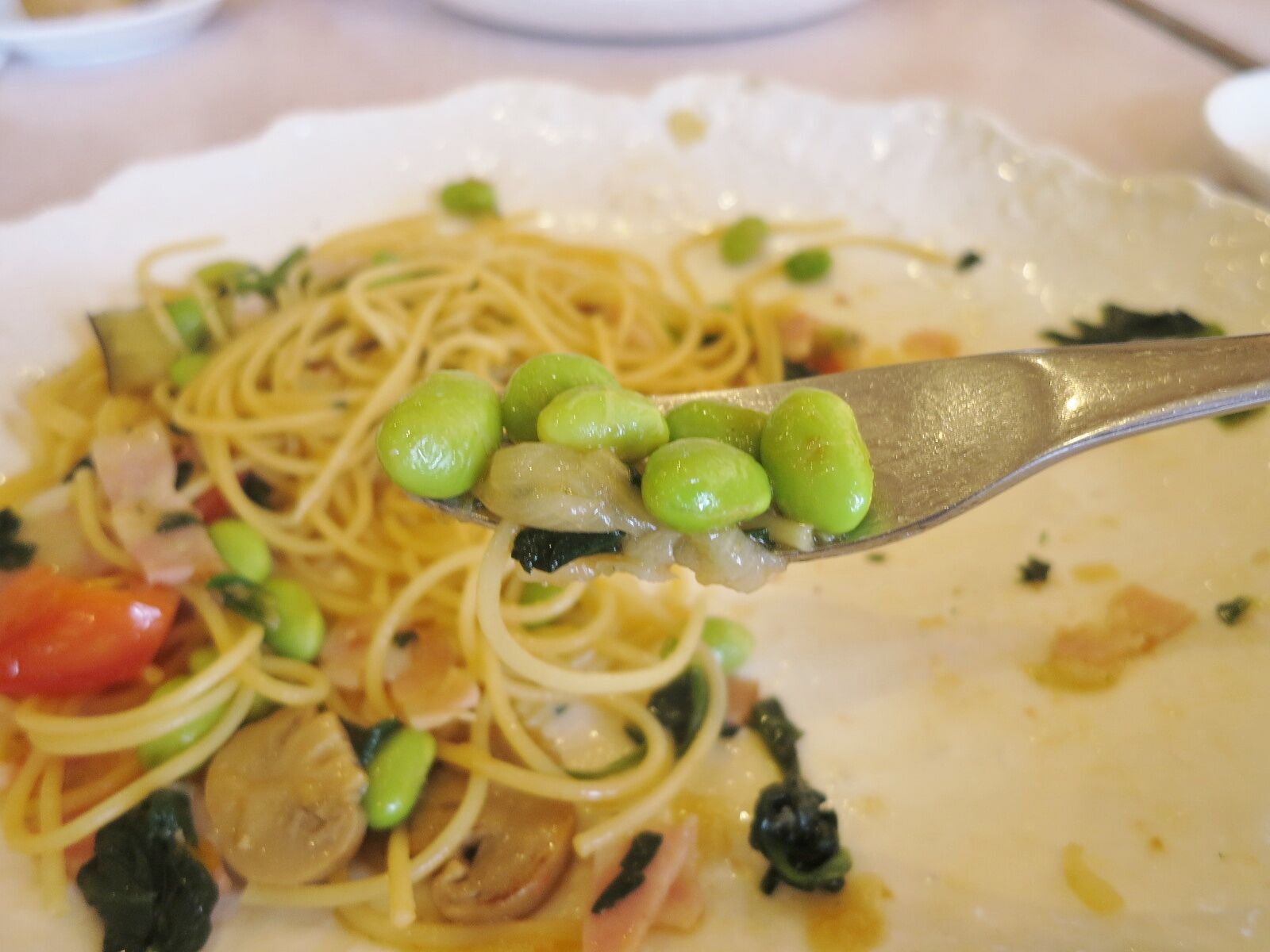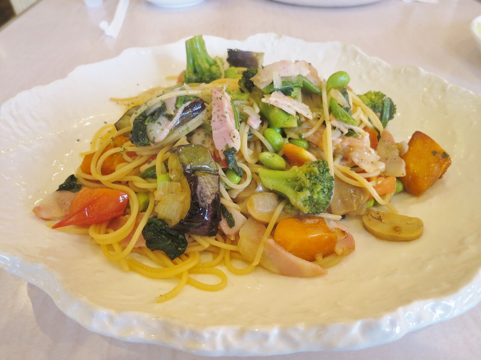 わたくしは、パスタ屋では余分なものつけるよりは単品大盛り派なので、「合せ野菜の和風パスタ大盛り」。