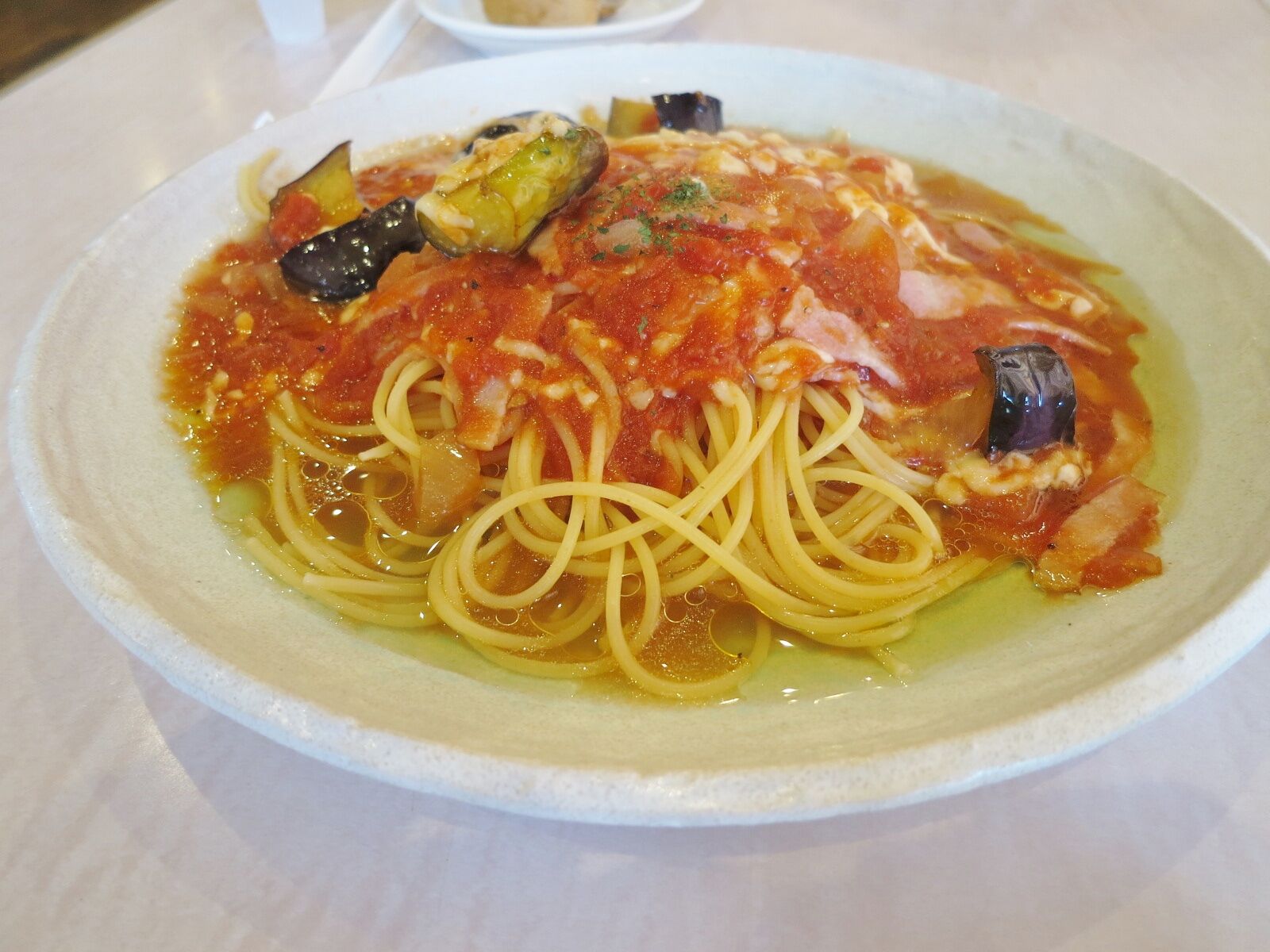 日替パスタランチ「モッツアレラチーズ入ナスとベーコンのトマトソース」。