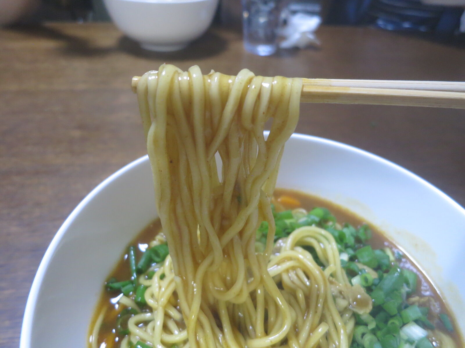 うーん、これで平打ちかなあ。佐野ラーメンみたいな完全平打ち縮れがよかったな。茹で上がった時のぬめりが強かったので、一旦ざるで水通しし再び電子レンジで温める作戦でいきました。