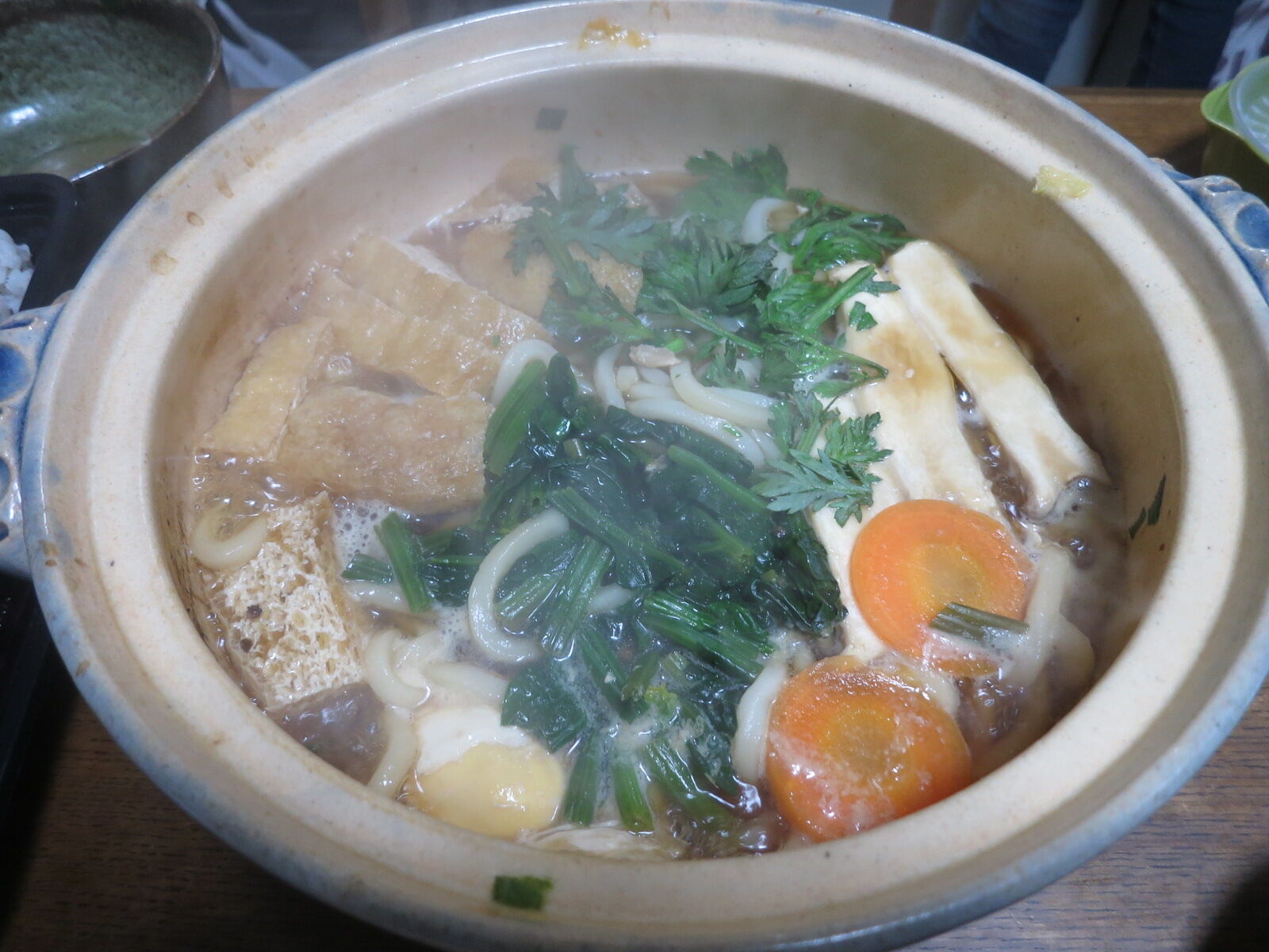 鍋焼きうどんだ!冷蔵庫を天地返しして降ったら落ちてきた、揚げとエリンギとほうれんそうとニンジンと春菊をお供に。熱々。