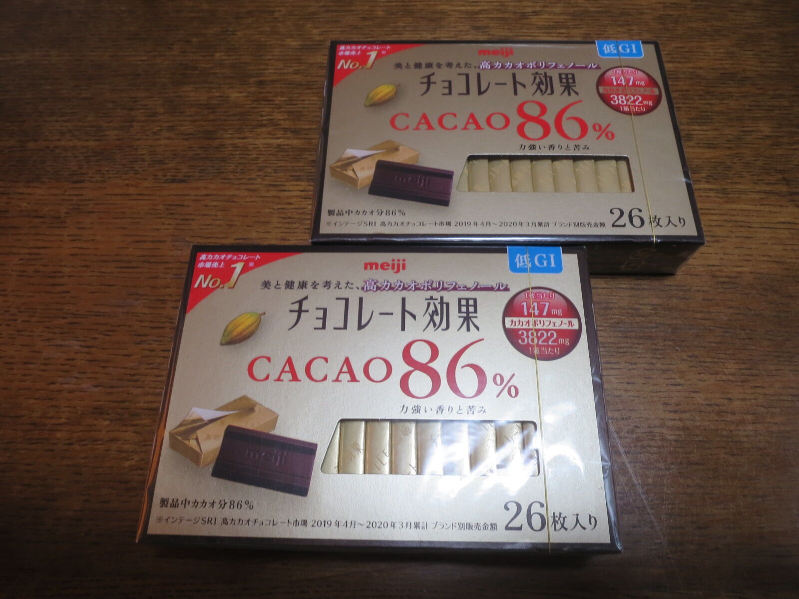 「72%」の商品もありますが、あえて「86%」を選びました。5g×26枚入り。70%で5枚ならば、86%なら4枚でいいだろう。2箱で13日分ある。ビターでおいしい。