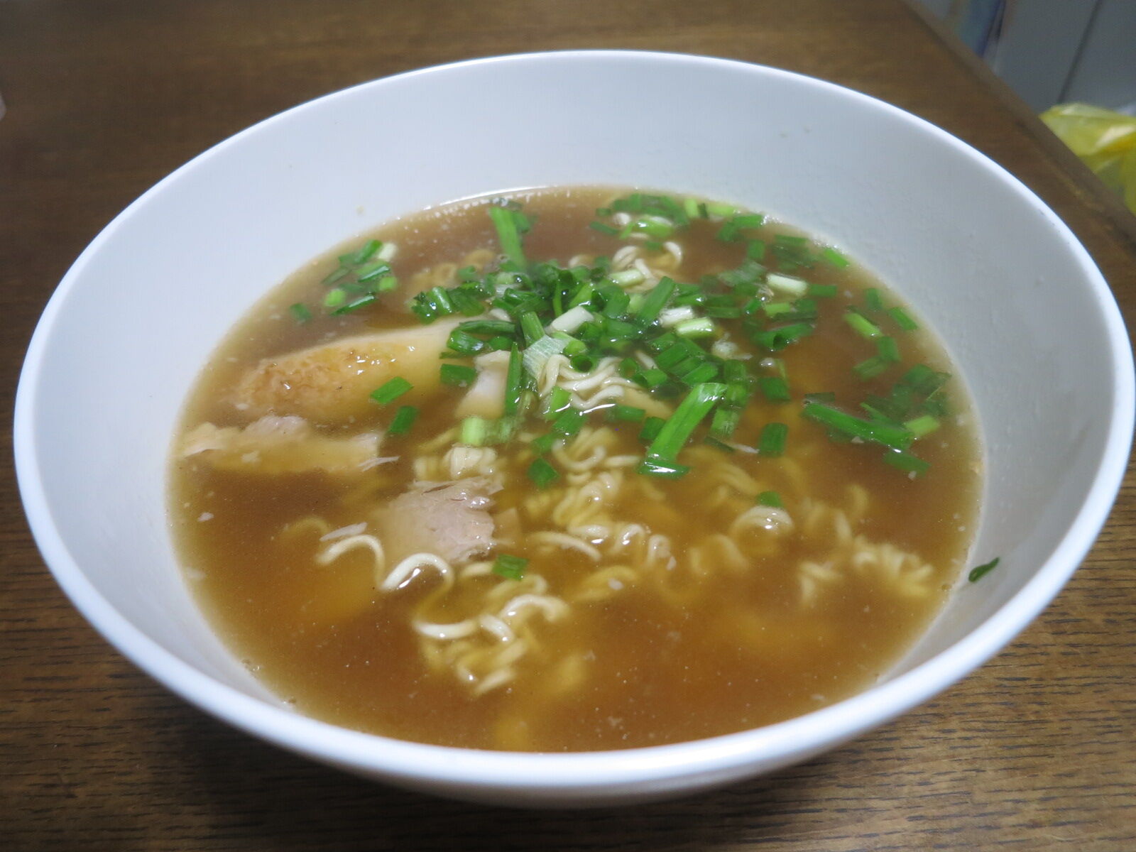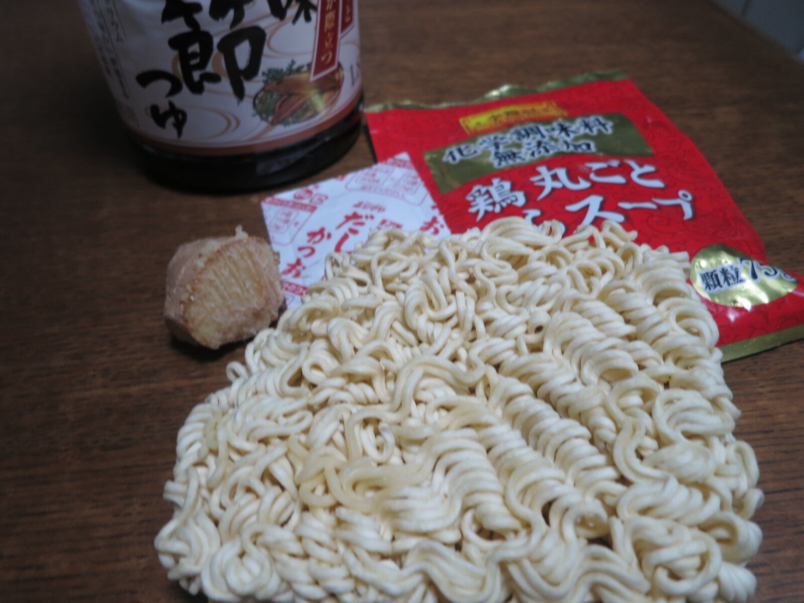 袋から麺だけを取り出し、スープにわたくしの自作スープ理論を適用してみました。「理論」もへったくれもありません。スープ材料はこの4者。
