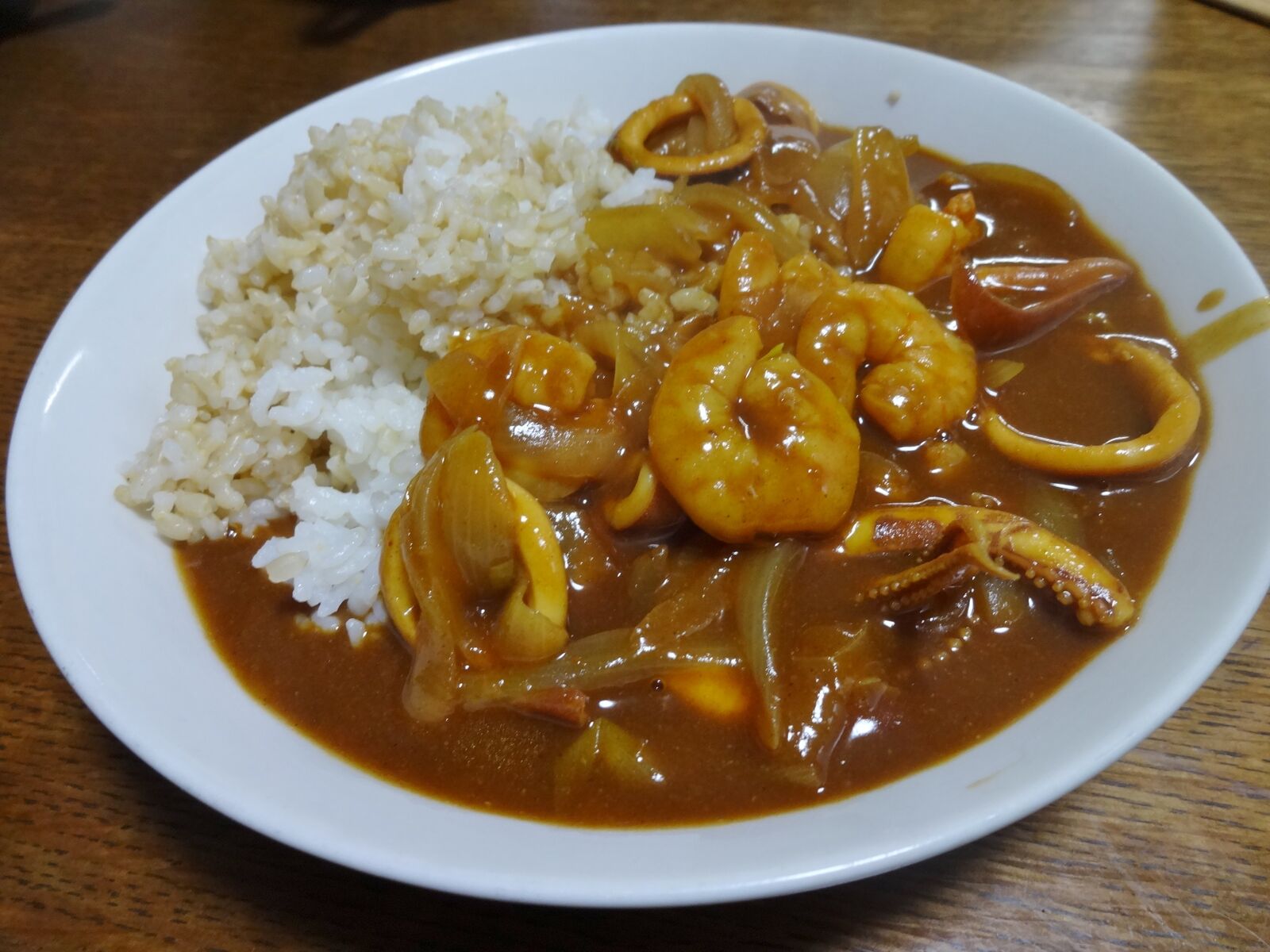 イカをたっぷり2パックと冷凍大粒エビ。コスモの無添加中辛ルーを辛口処理して、超豪華辛口シーフードカレー。大好きという思いを形にしました。うまい。