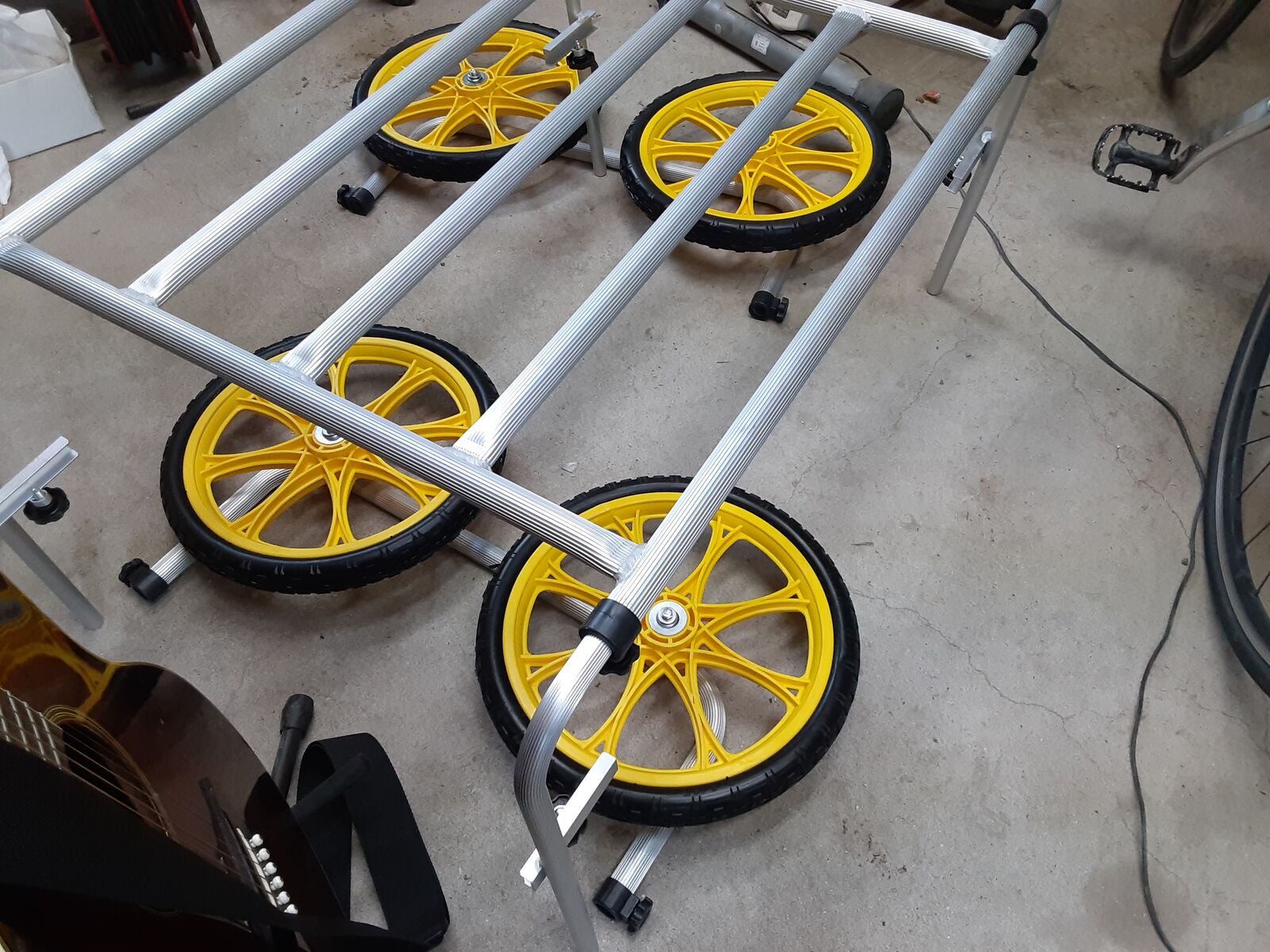 突然台車が前に進まなくなったので確認すると、なんと車輪の車軸が折れています。アルミ溶接した車軸そのものが折れているので、もはや修復は不可能です。