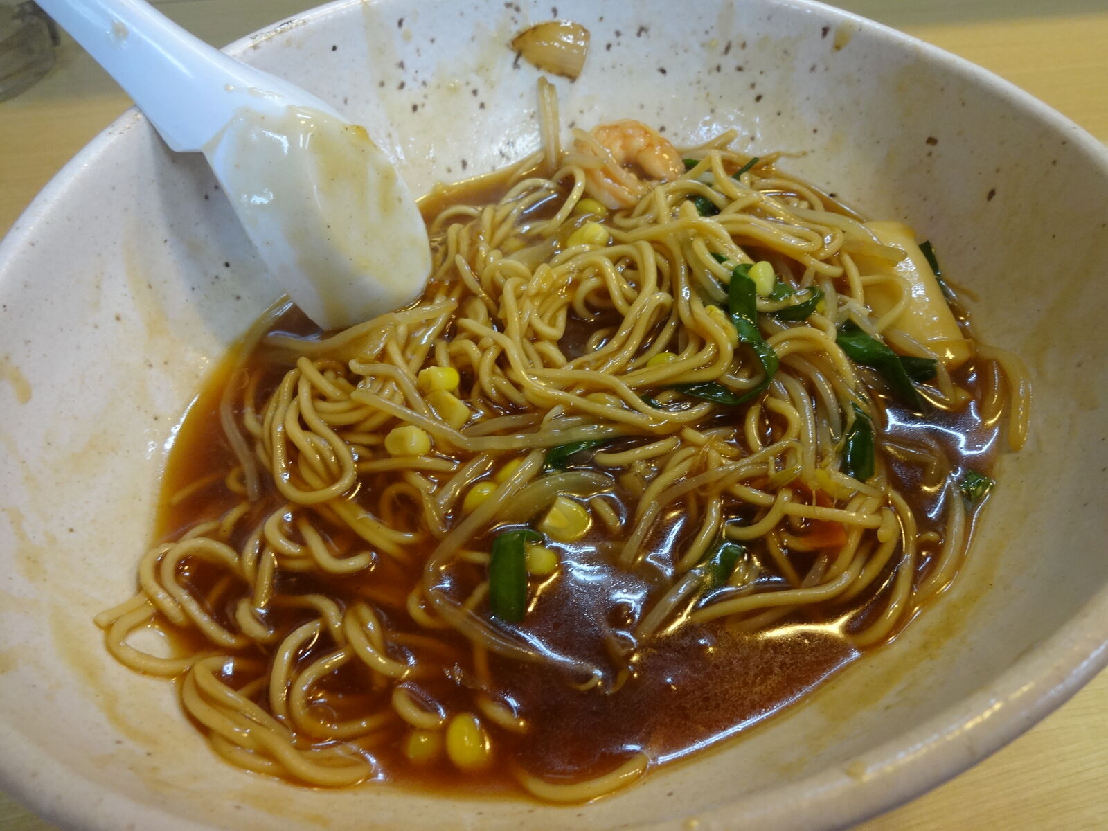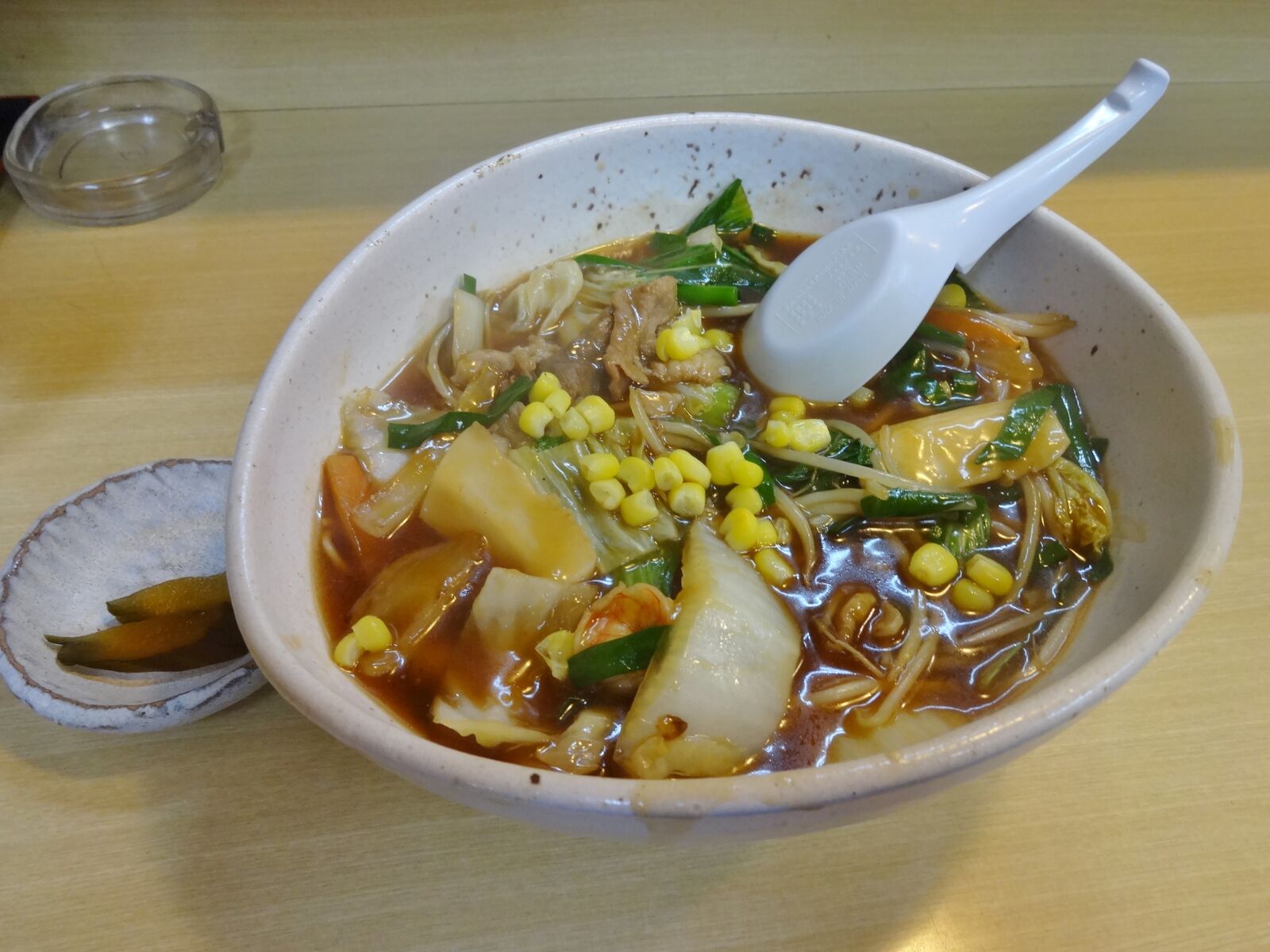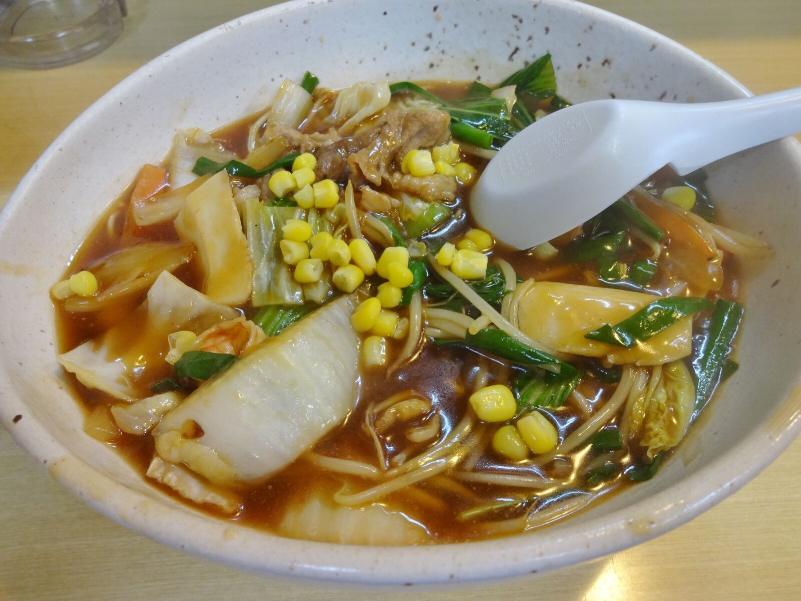 野菜は、玉ねぎ、にんじん、ニラ、もやし、はくさい?、キャベツ?、チンゲン菜?、コーン。
