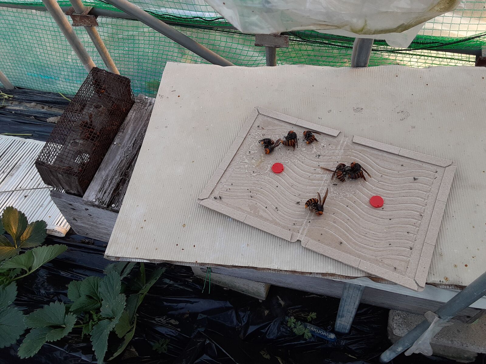 2匹獲れていました。粘着シートの上に6匹、捕獲器の中に中に5~6匹いますので、全部で10匹以上つかまえたことになります。それでもまだ、少なくとも1匹はハウスの中で確認しています。