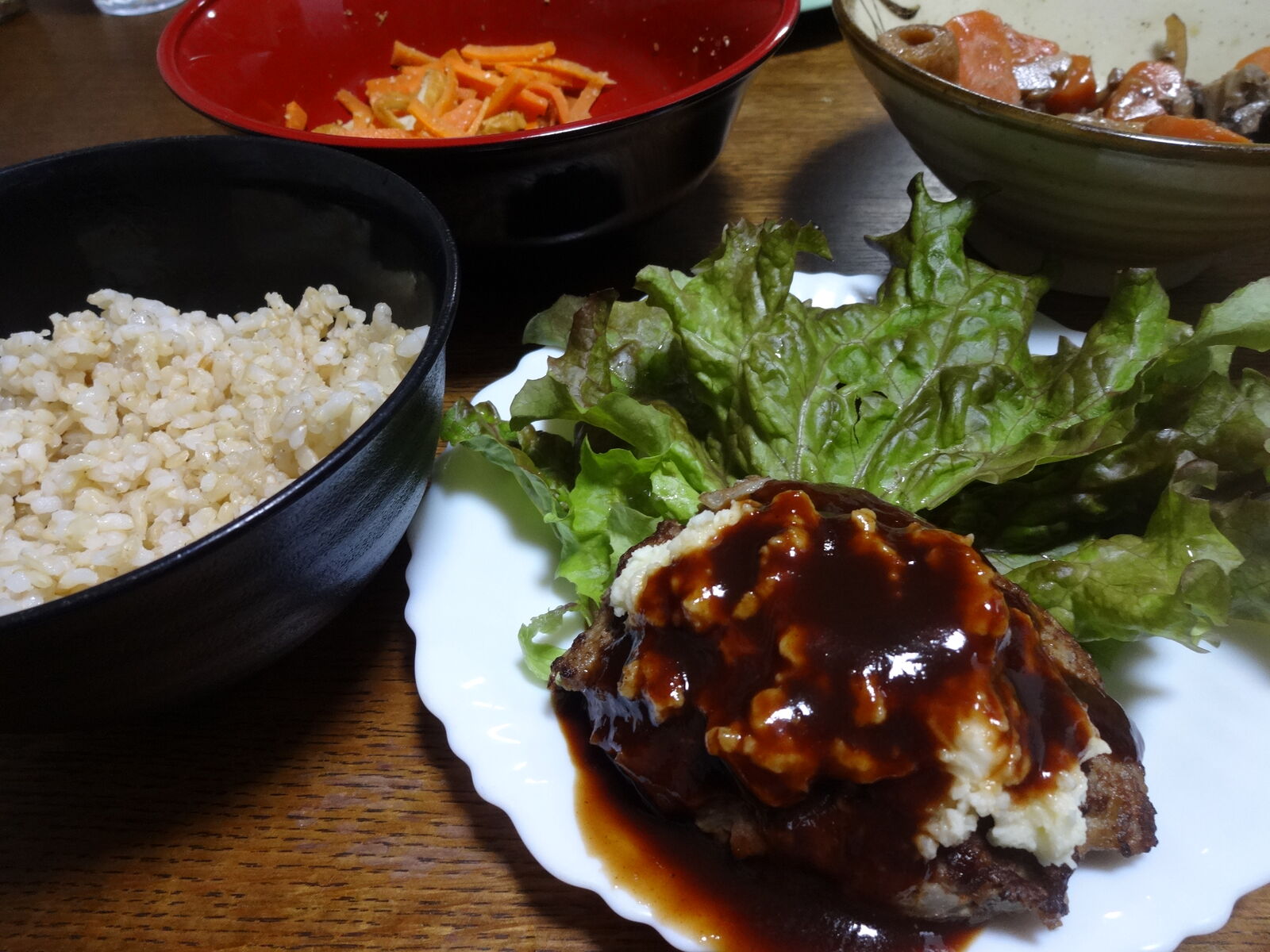 自家製ビッグハンバーグ。昨今の値上げラッシュを反映して、もやし入りとか。節約しながら、豊かに生きていく。料理人に感謝。