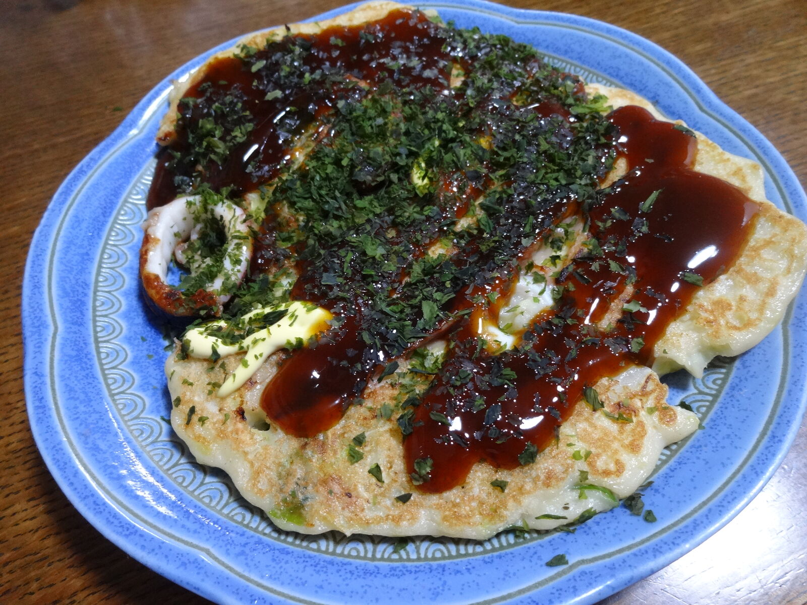 山芋入りお好み焼き。私の分だけ、大好きなイカを入れてくれました。