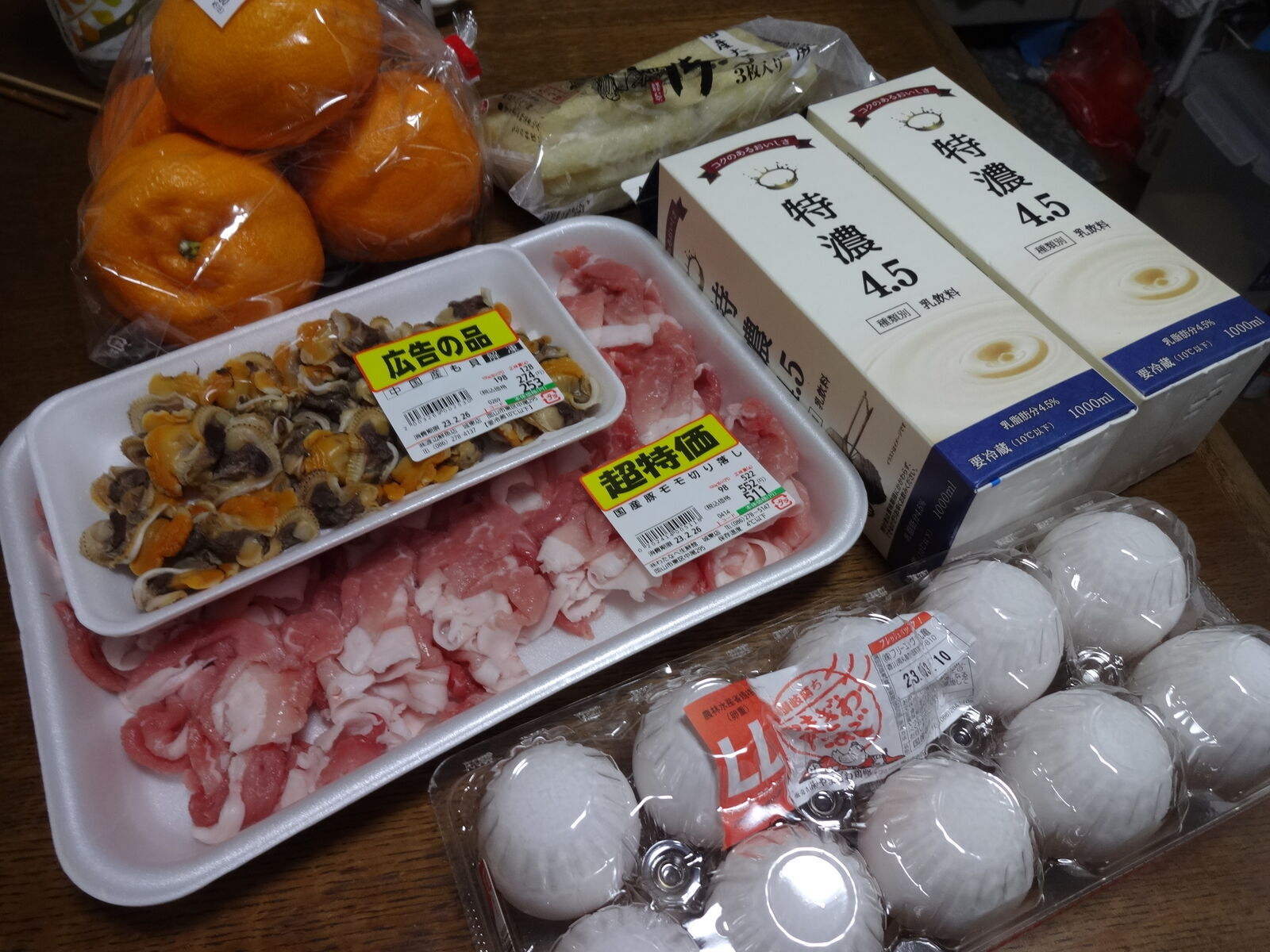 豚肉は100g¥98で安かったし、も貝も旬の真っ只中で安くて体が求めているし、4.5牛乳はあいかわらず¥178で出してくれているし、揚げは絶対要るし、食べてみたかった品種のみかんもあったしで、最終的な総額は¥2000近くなってしまいましたが、何だか今日はいい買い物ができたなとご満悦な気分になりました。
