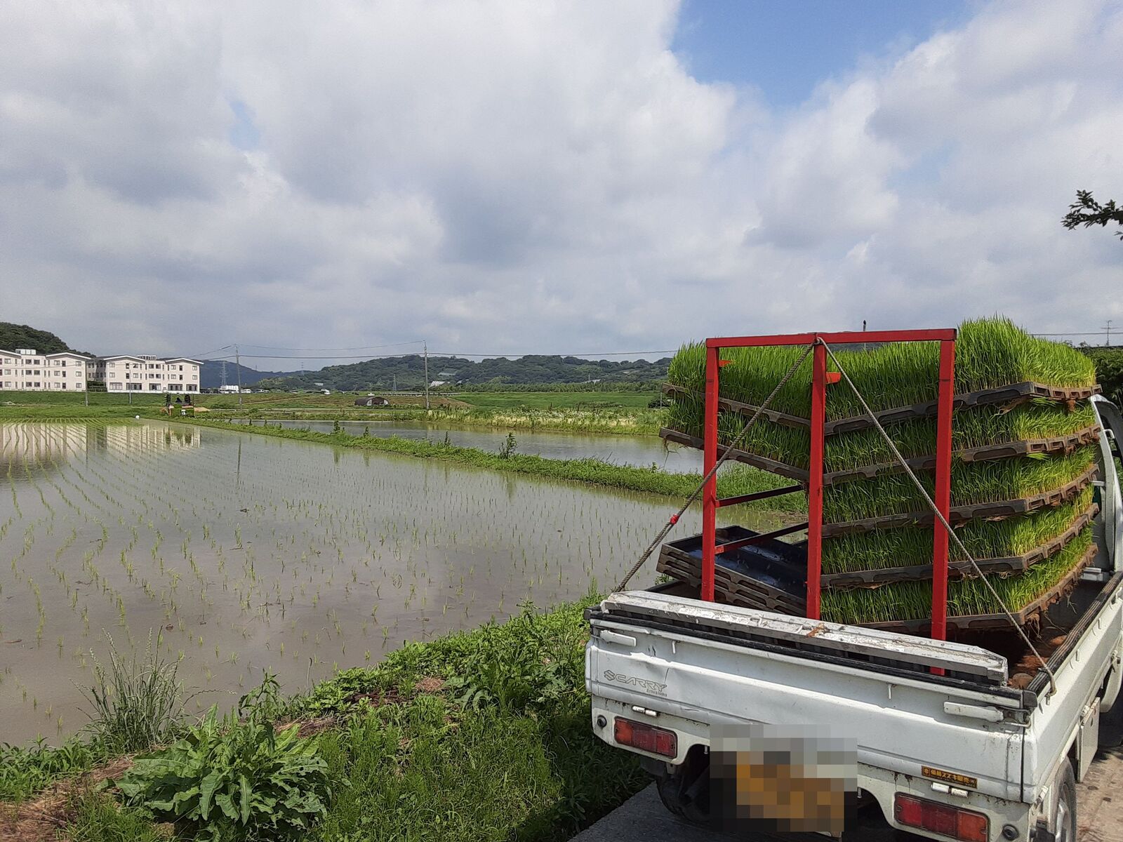 田植えといっても、田植え機は息子さんが乗るので、私は補助作業で、苗場から苗を軽トラの架台に積んで運び、田植え機に補充していく作業が中心になります。肥料の運搬補充もあります。