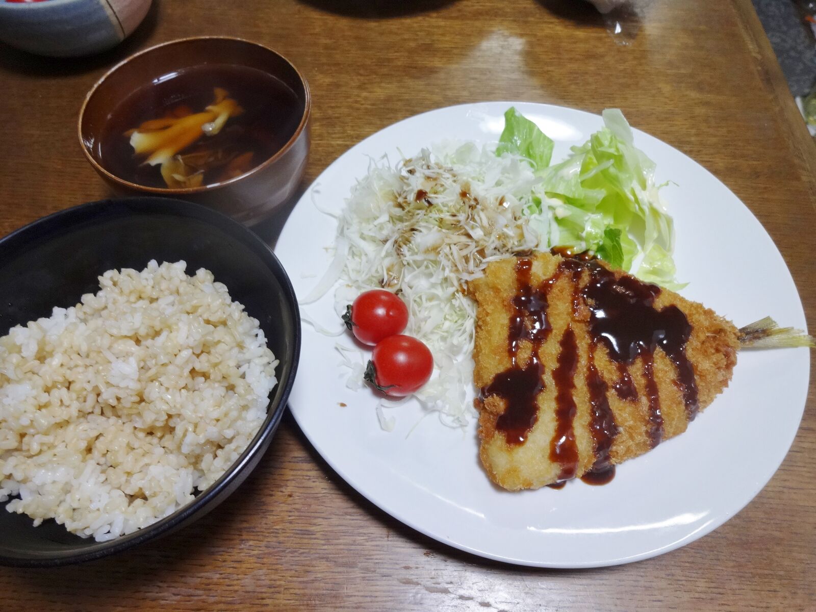 スーパーで買ってきた肉厚アジフライと玄米で、夜定食。アジフライは、税別¥198の2割引き。