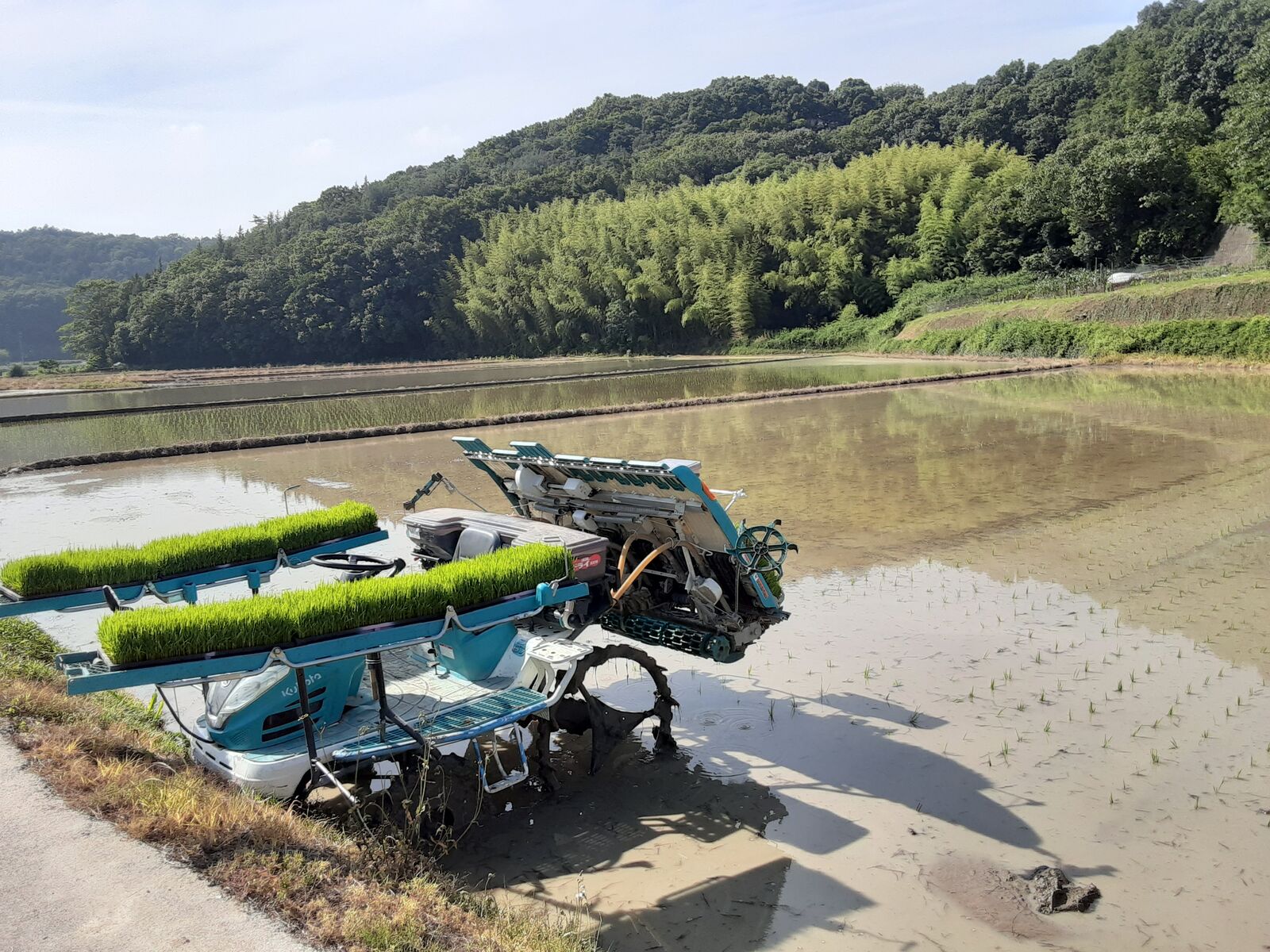 愛車クボタ田植え機と1年ぶりの再会。去年私がぶっ壊した植え付け部のレールもちゃんと修理してくれてあって、快調そのものでした。