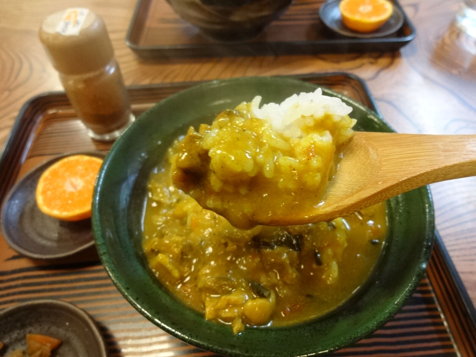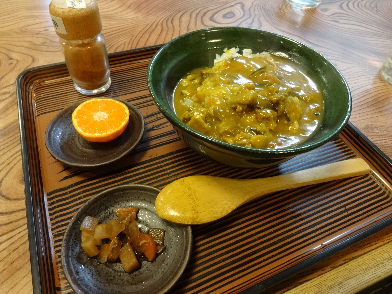 チキンごろごろ。スパイス系エキゾティックなカレーで、あとで辛味がじわっと効いてきます。ちょっと少なめですが、うどんみたいに変なプライドが邪魔をして絶対に「大」や「特大」を注文し、腹いっぱい食べて血糖値が爆上がりするようなことが無いのが、またいい。腹八分目でいきましょう。