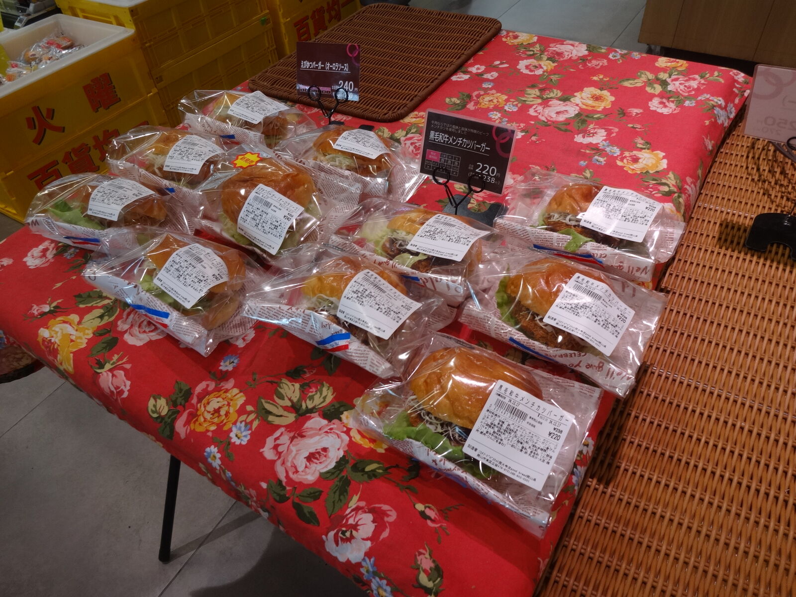 今マイブームの「黒毛和牛メンチカツバーガー(税込¥238)」を買うために。二匹目のドジョウをねらって、隣には新発売の「海老カツバーガー」で置いてありました。誘惑は断ち切りました。