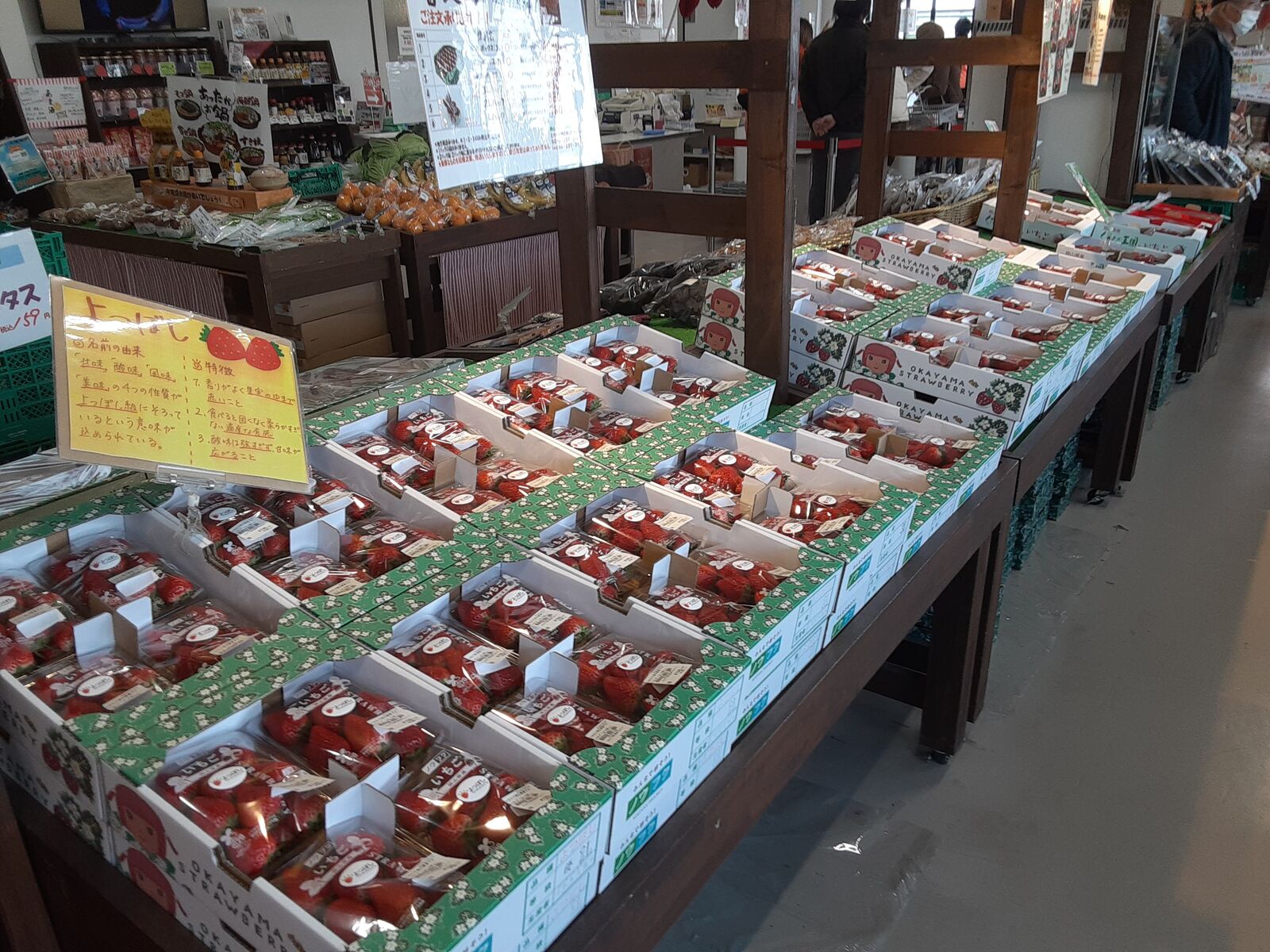 イチゴがいっぱい並んでいます。品種は「よつぼし」が多いのかな。種から作る珍しいイチゴです。いいなー、イチゴがたくさんあって。イチゴハウスでは、いちご狩りも稼働中です。
