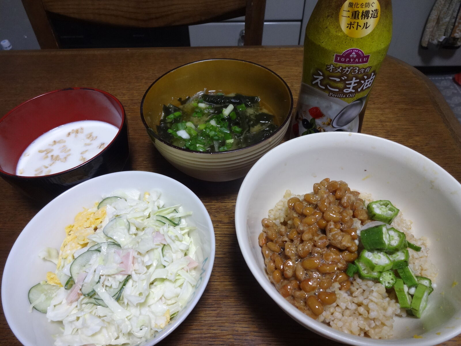 オクラは、赤磐の産直店(小さい方)で安いの見つけました。納豆はコスモスPB。えごま油は、平島のマルナカにあったトップバリューブランド。みそ汁は無添加のもので、ワカメと玉ねぎが基本ですね。