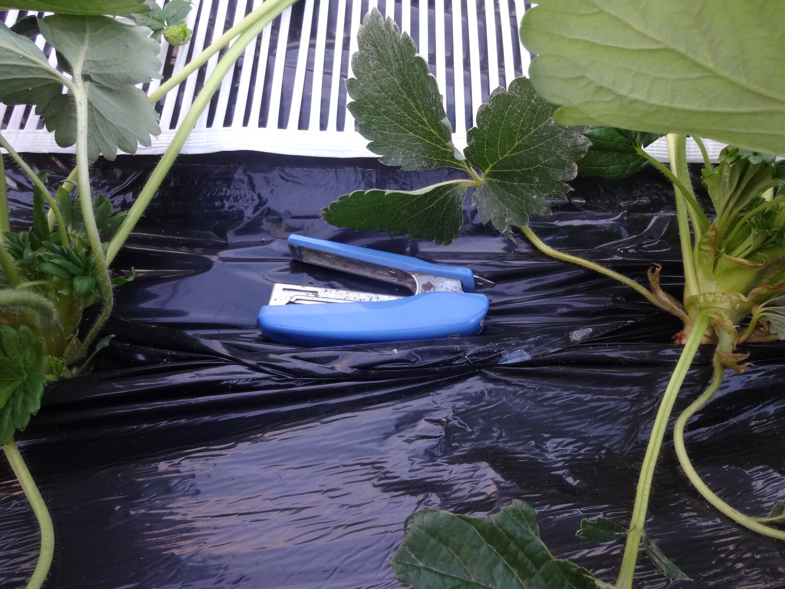今は、条間側の黒マルチと通路側の黒マルチをホッチキスで止める作業をしています。
