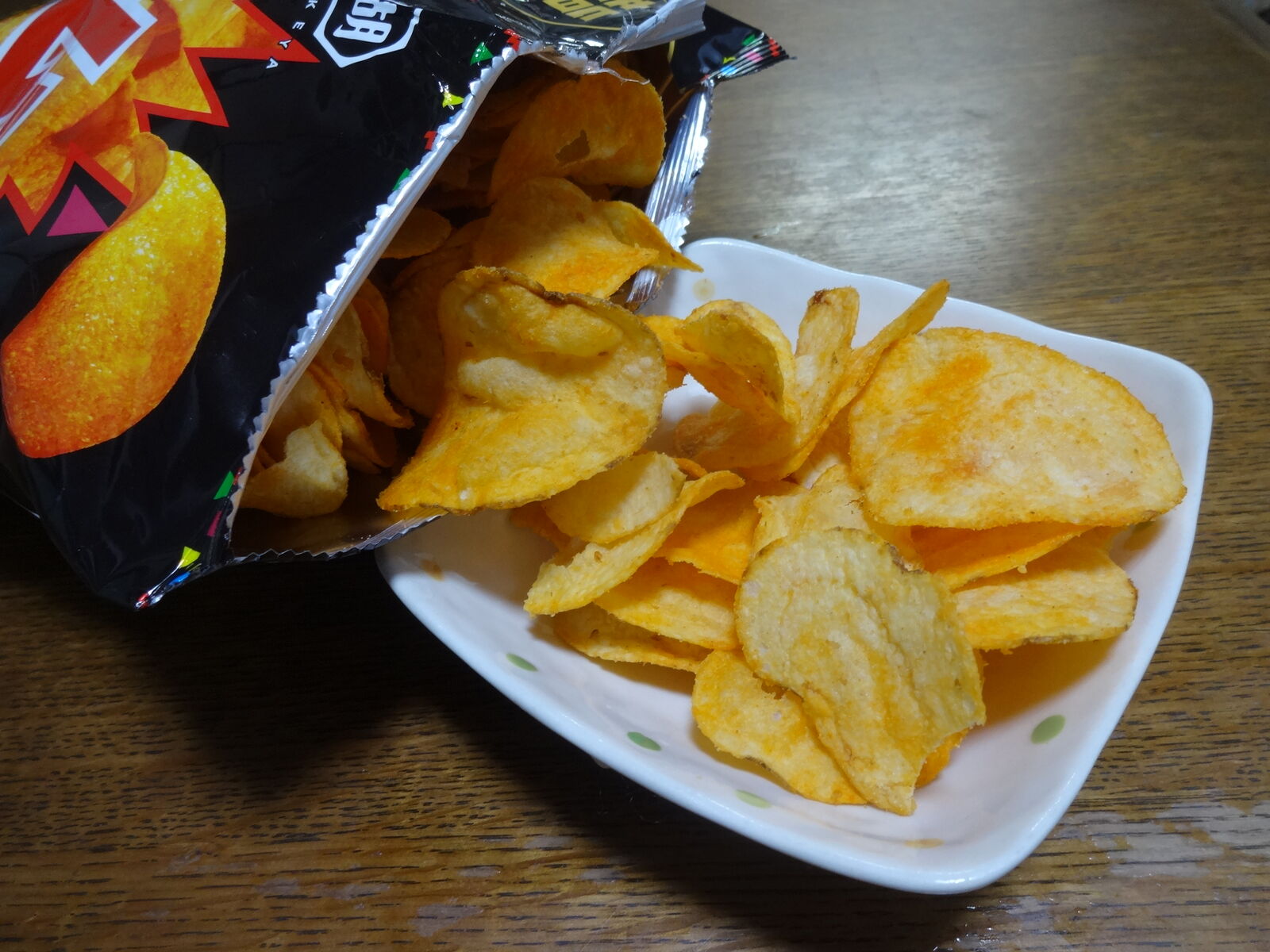 そういうわけで、またまたついつい買ってきてしまった「カラムーチョ大盛りサイズ」。言われてみれば、チップ片が少し小さいような気もします。
